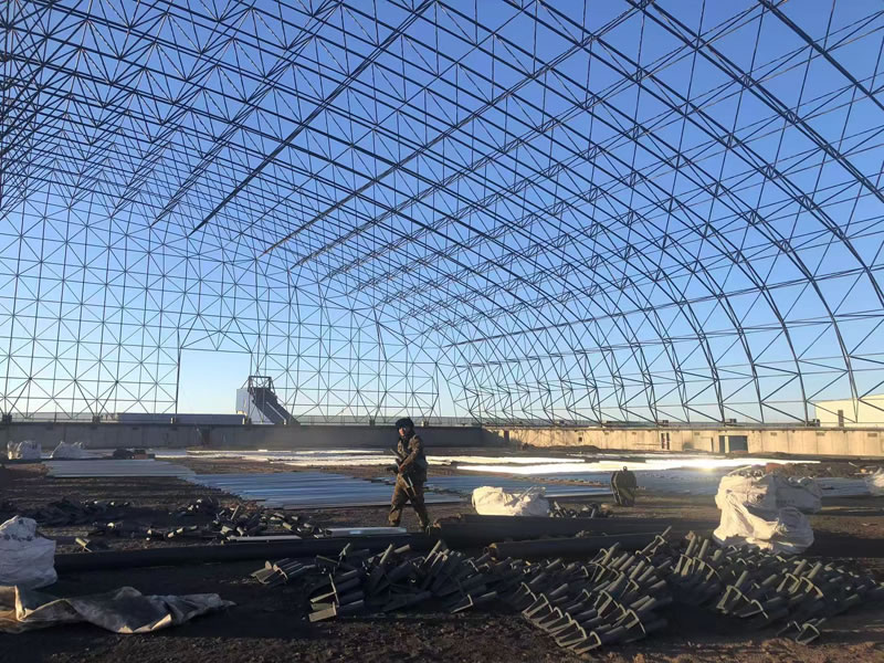 3、材料:正放四角錐螺栓球節(jié)點(diǎn)網(wǎng)架,按照甲方確認(rèn)的圖紙設(shè)計要求加工制作。網(wǎng)架主材材質(zhì)為Q355B鋼管,底漆二道70um,主檁條鍍鋅C型鋼C220*75*20*3.0,次檁條鍍鋅C型鋼C180*70*20*2.5,屋面板0.5mm厚彩鋼單板